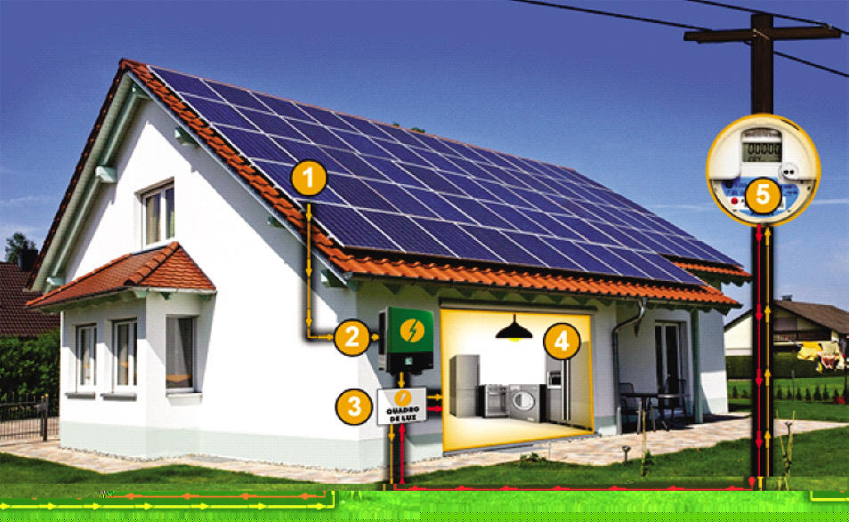 5 – O excedente de eletricidade volta para a rede elétrica local através do relógio de luz (relógio de luz bi-direcional). Esse relógio de luz mede a energia da rua que é consumida quando não tem sol e, a energia solar gerada em excesso quando tem muito sol e é injetada na rede da distribuidora.